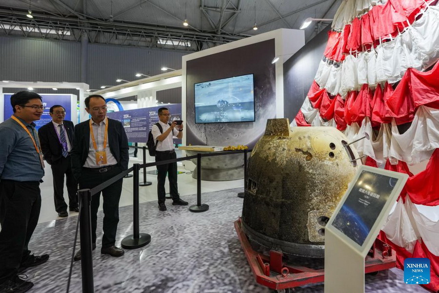 Gäste betrachten die von der Chang'e-6-Mission zurückgekehrte Kapsel, die auf einer Luft- und Raumfahrtausstellung ausgestellt ist. (Foto: Xinhua/Wang Xi)