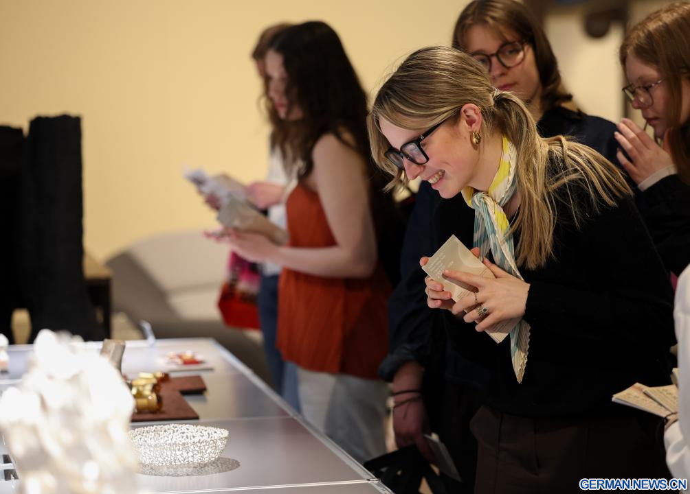 Besucher betrachten Exponate auf der Ausstellung „Ursprünge der chinesischen Ästhetik: Liangzhu-Kultur und zeitgenössische Kreation“ während der Mailänder Designwoche in Mailand, Italien, 22. April 2026. (Quelle: Xinhua/Li Jing)