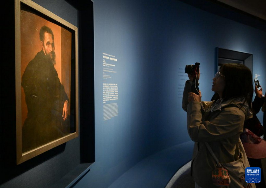 Eine Journalistin fotografiert das ikonische „Porträt von Michelangelo Buonarroti“, das Jacopino del Conte zugeschrieben wird. Es ist eines der zentralen Exponate der Ausstellung. (Foto: Li He/ Xinhua)