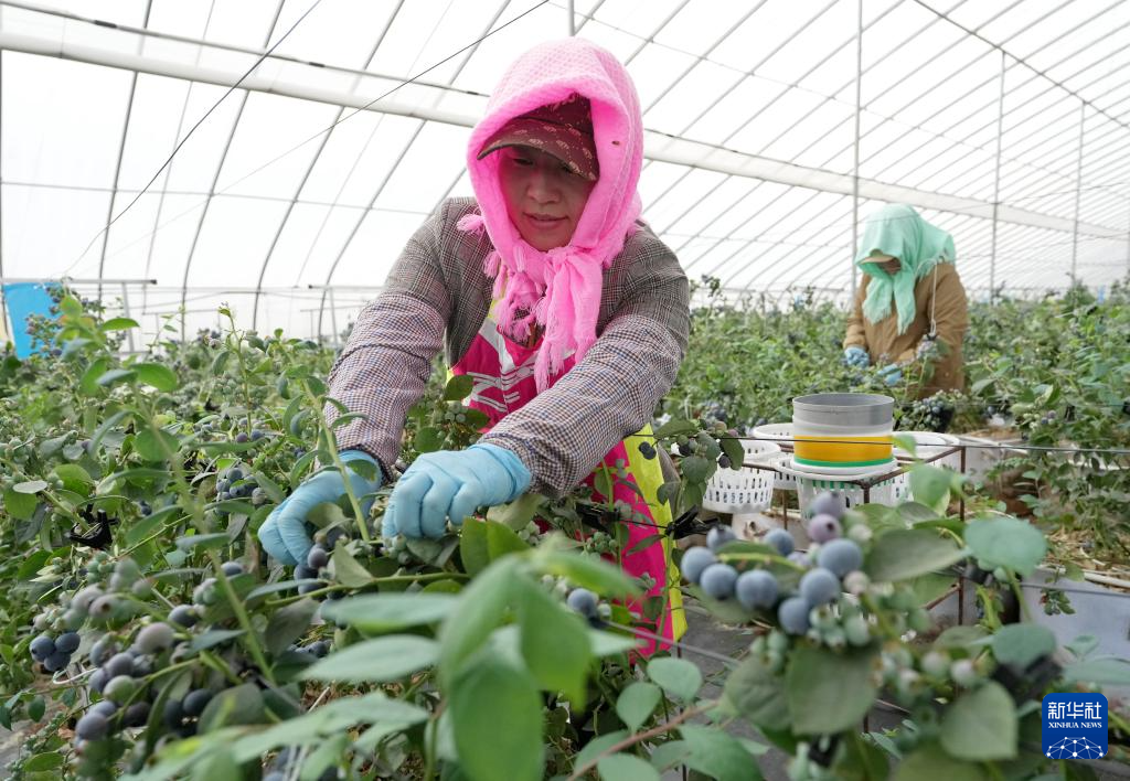Eine Bäuerin pflückt Blaubeeren in einem Gewächshaus auf der Gemüseanbaubasis im Dorf Mujing, Kreis Lulong, Provinz Hebei. (Foto vom 27. April 2026, Yang Shiyao/Xinhua)