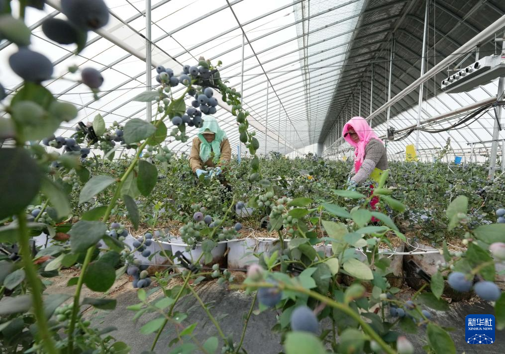 Eine Bäuerin pflückt Blaubeeren in einem Gewächshaus auf der Gemüseanbaubasis im Dorf Mujing, Kreis Lulong, Provinz Hebei. (Foto vom 27. April 2026, Yang Shiyao/Xinhua)
