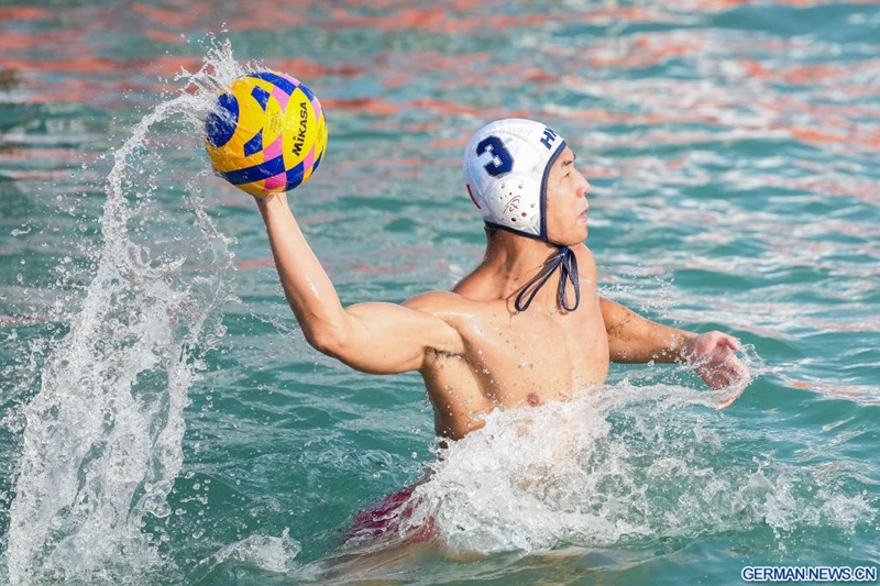 Cheng Hei Man aus Chinas Hongkong wirft den Ball während des Wasserball-Finales der Männer im Rundenturnier zwischen Chinas Hongkong und Kasachstan bei den 6. Asian Beach Games in Sanya in der südchinesischen Provinz Hainan, 26. April 2026. (Quelle: Xinhua/Chen Sihan)