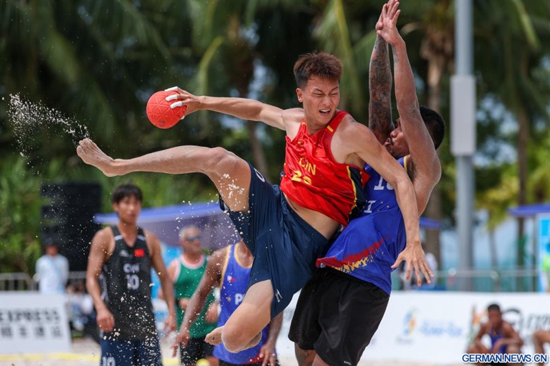 Zhao Rulong (l.) aus China tritt beim Vorrundenspiel der Gruppe A im Beachhandball der Männer zwischen den Philippinen und China bei den 6. Asian Beach Games in Sanya in der südchinesischen Provinz Hainan an, 26. April 2026. (Quelle: Xinhua/Li Bo)