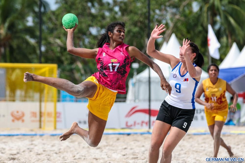 Rashmi Nirmani Anthoni Pererage (l.) aus Sri Lanka tritt beim Vorrundenspiel der Gruppe B im Beachhandball der Frauen zwischen Sri Lanka und der Mongolei bei den 6. Asian Beach Games in Sanya in der südchinesischen Provinz Hainan an, 26. April 2026. (Quelle: Xinhua/Li Bo)