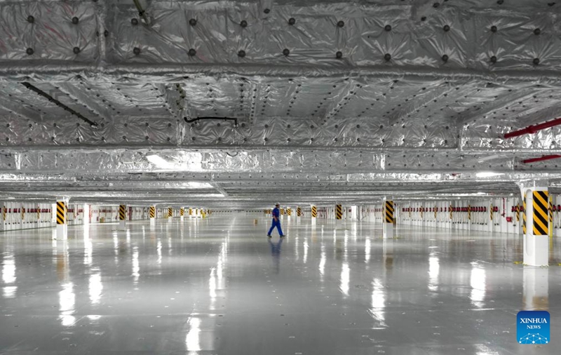 Ein Mitarbeiter geht am 14. Stockwerk des Parkdecks auf dem Autotransporter vorbei. (28. April 2026, Xinhua)